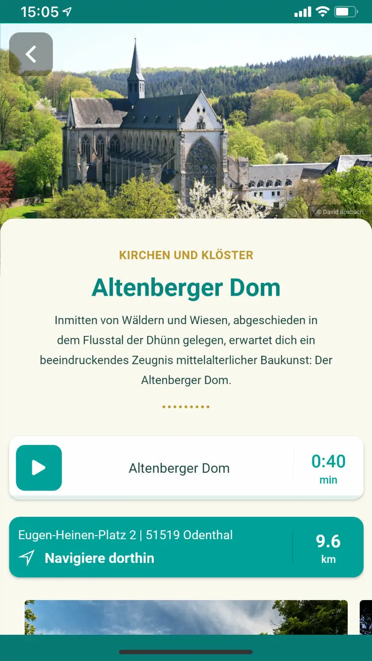 An allen braunen Hinweistafeln auf deiner Strecke erhältst du automatisch eine kurze Geschichte zu den Sehenswürdigkeiten und Orten entlang deiner Strecke erzählt. Die Audio-Datei startet automatisch, wenn du am Schild vorbeifährst. Zudem siehst du auf der Karte, wie weit der Ort von deiner Position entfernt ist.