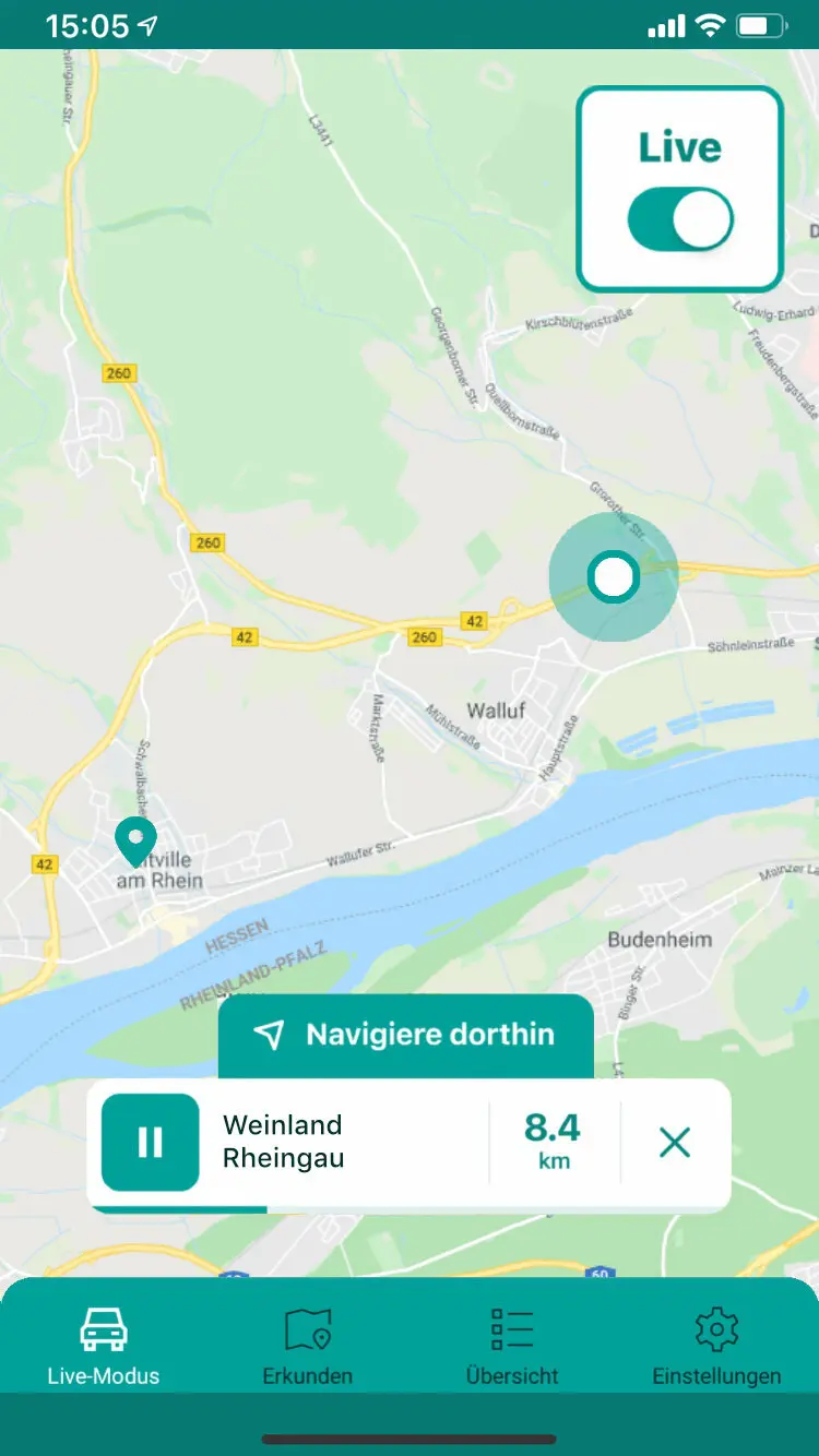 Öffne den Erlebnisguide vor Fahrtantritt und aktiviere den Live-Modus. Stelle sicher, dass du dem Erlebnisguide erlaubt hast, während der Nutzung auf den Standort zuzugreifen. Das beste Hörerlebnis auf der Fahrt genießt du, wenn dein Smartphone über Apple CarPlay, Android Auto oder Bluetooth-Audio mit deinem Fahrzeug verbunden ist.